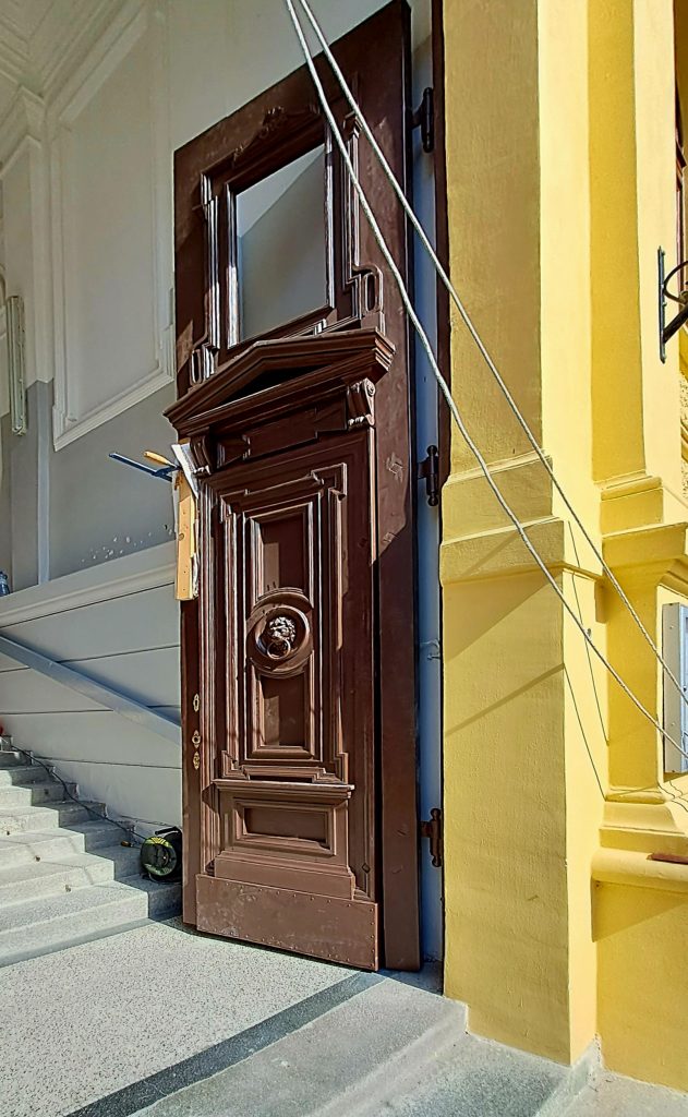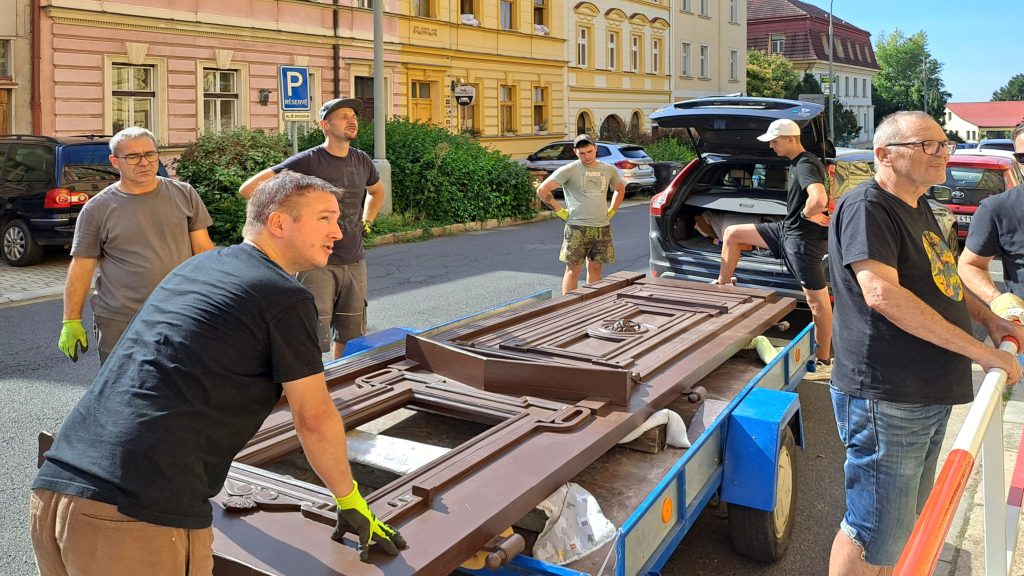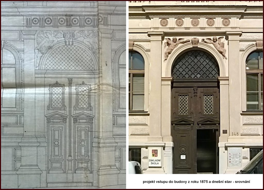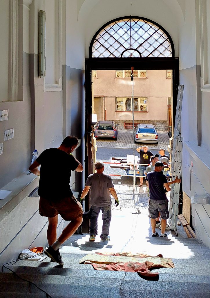 Blíží se začátek školní roku a opravy ve škole stále zdárně pokračují. Dnes restaurátorská firma Telamon s.r.o. z pražských Modřan osazovala zrestaurovaná křídla původních vchodových dveří ( spíše vrat) z roku 1876, která byla tehdy zhotovena v historizujícím slohu poslední třetiny 19. století. Pracovníci firmy při osazování museli použít kladku, křídla jsou mimořádně těžká. Dveře jsou po renovaci zase jako nové.